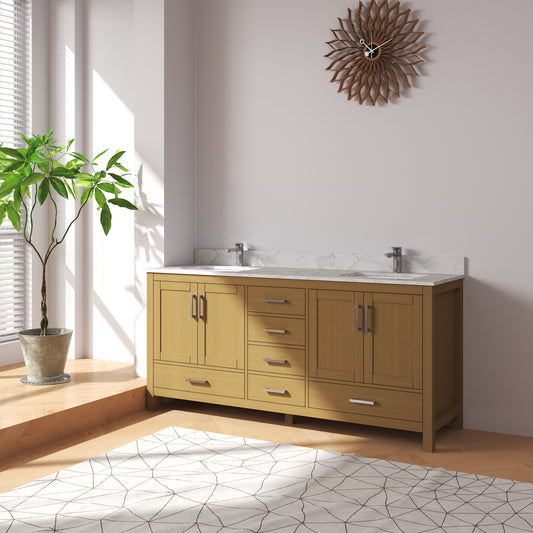 Medunjess 72" Double Sink Rubberwood Vanity with Quartz Top & 6 Drawers