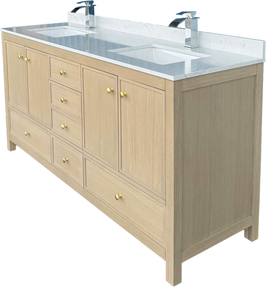 Medunjess 72" Double Sink Rubberwood Vanity with Quartz Top & 6 Drawers