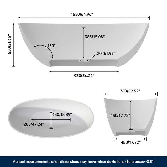 Medunjess 65" White Oval Luxury Freestanding Solid Surface Resin Stone Soaking Tub