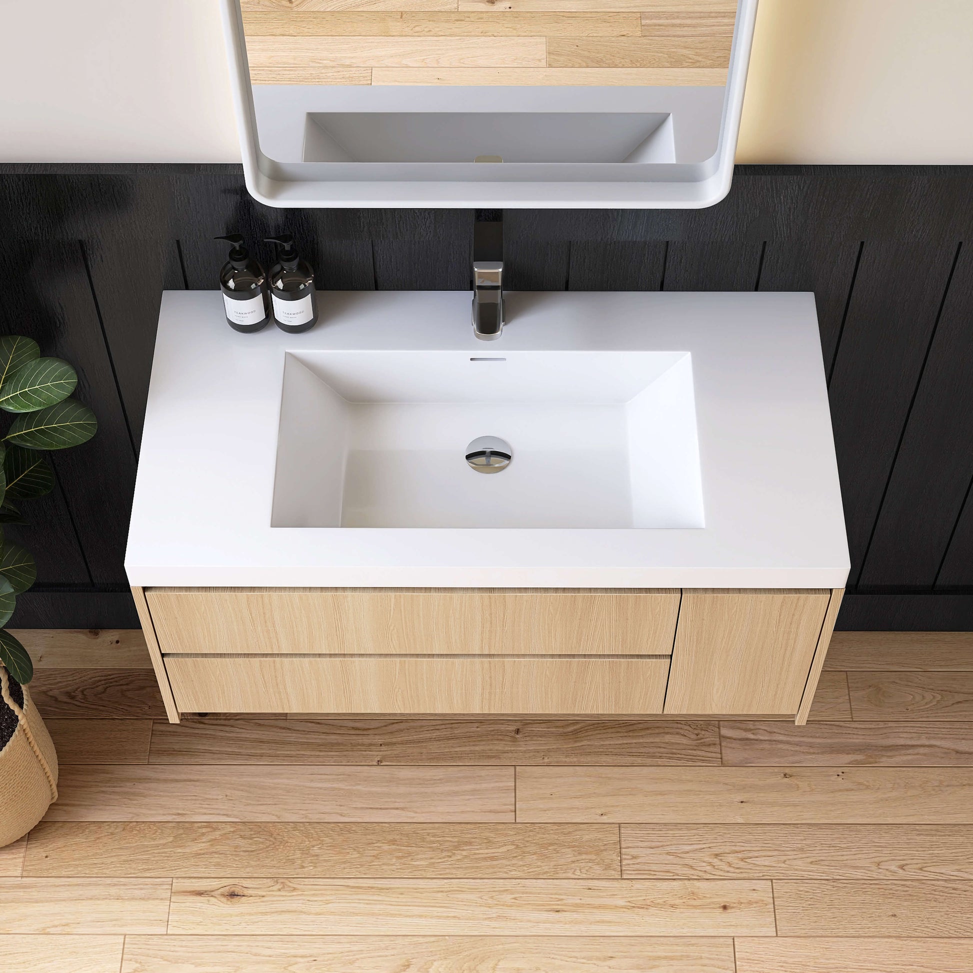 Integrated Console Design: Features a built-in console or generous ledge, providing a practical surface for toiletries and decor, while maintaining a light, open footprint.