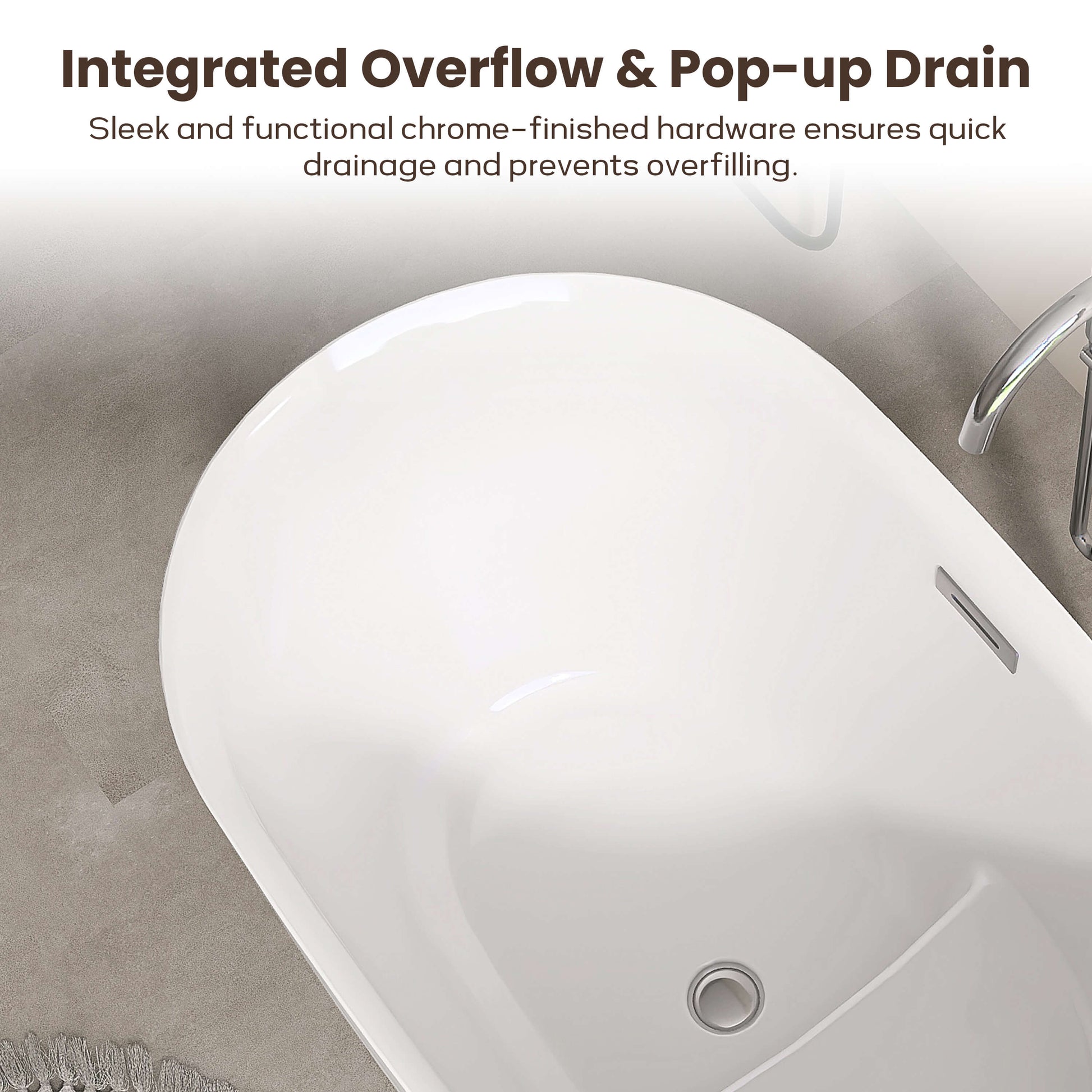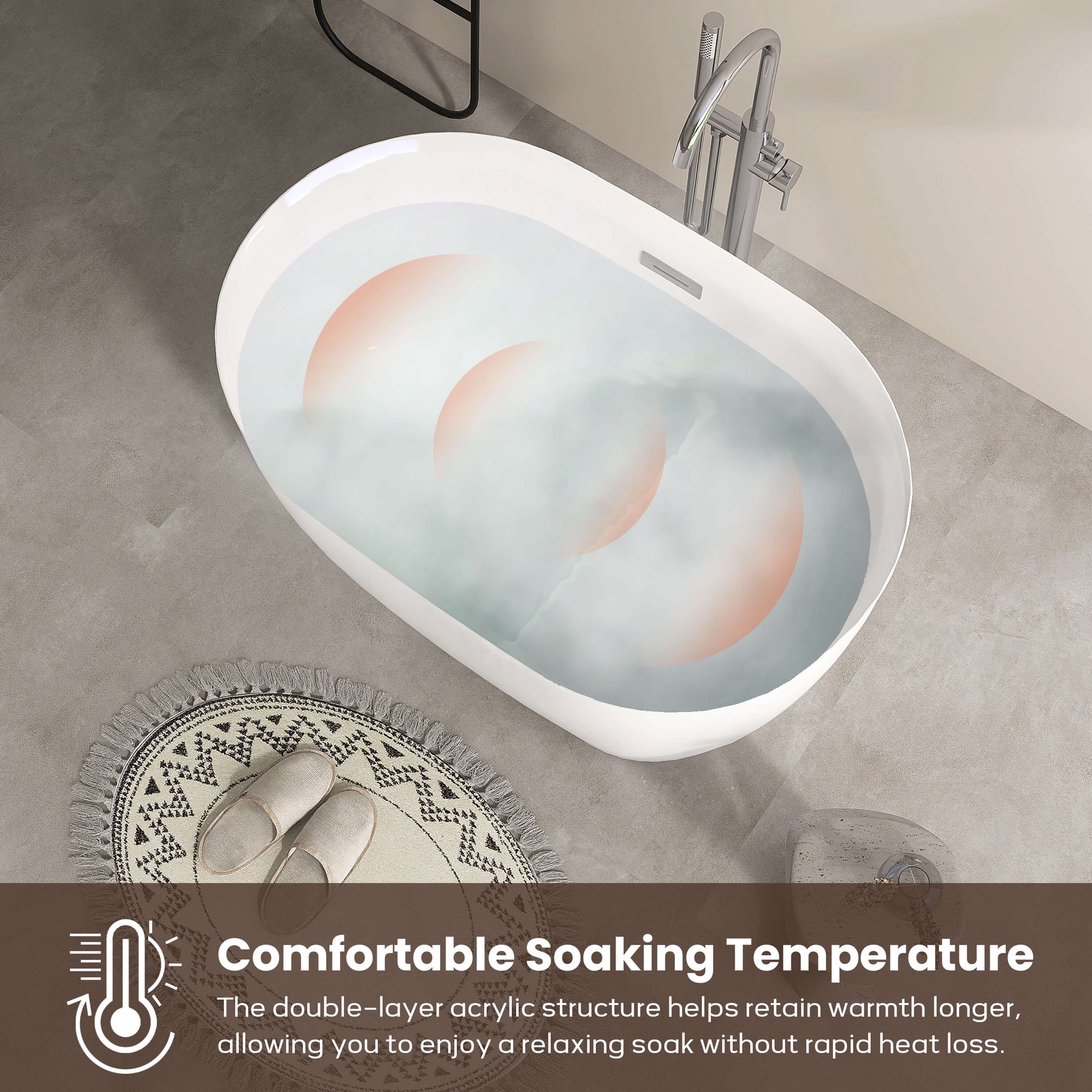 Crafted from high-quality acrylic, it boasts a mirror-like surface and a soft, skin-friendly feel. The material's excellent heat retention ensures the water remains warm for extended periods. At the same time, it's durable and easy to clean, leaving you looking fresh and looking new with a single wipe.