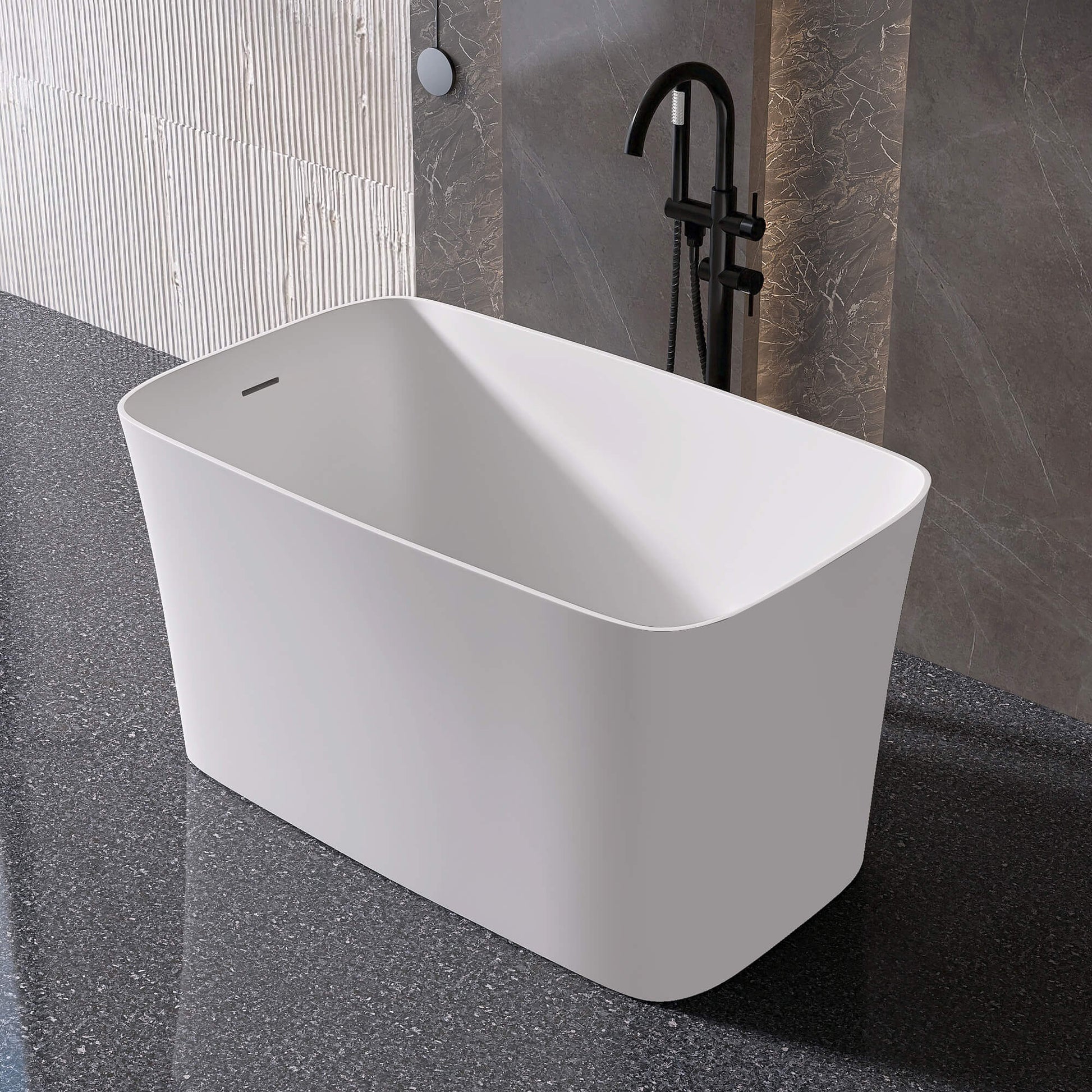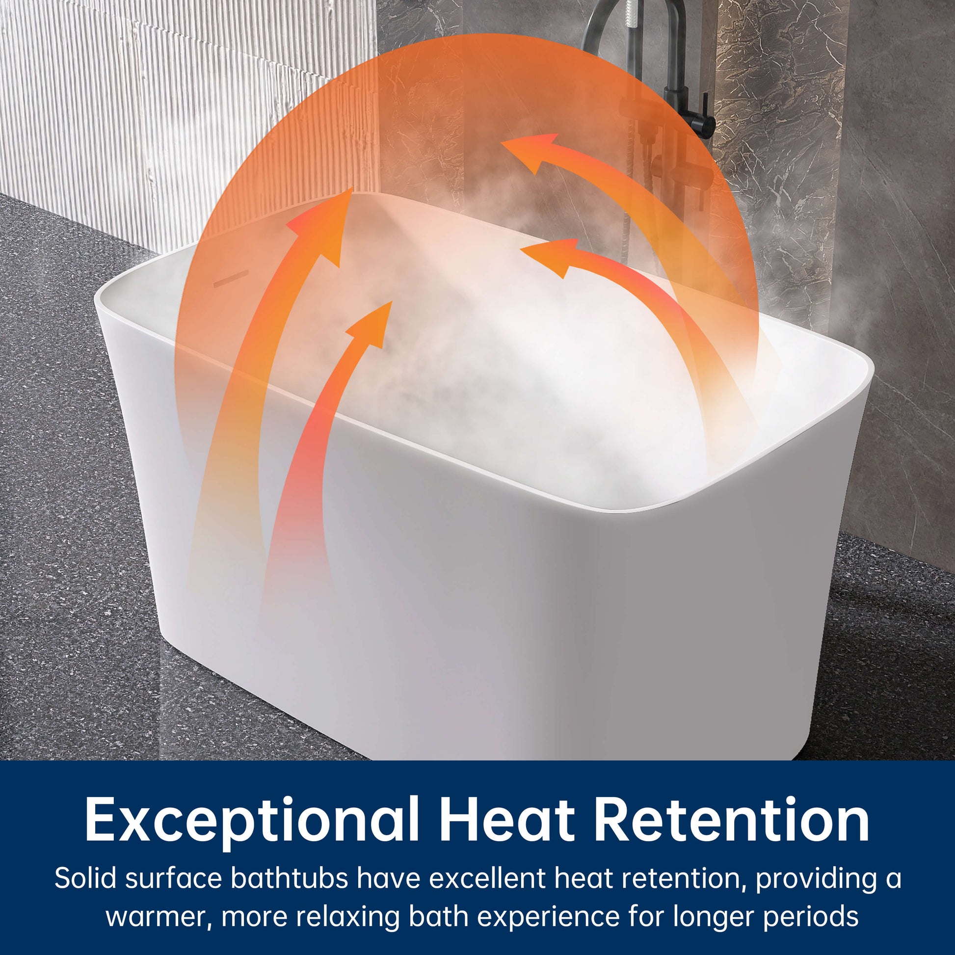 Crafted from 100% pure stone resin (Solid Surface) infused with aluminum powder for reinforced strength, this opulent Japanese bathtub showcases a robust, scratch-resistant exterior. This rectangular solid surface soaking bathtub has a hard texture, durable, and very easy to clean. Heavy and elegant, its smooth, matte finish offers a luxurious feel and modern aesthetic, while its composite material ensures strength and longevity. Thanks to its special material, you will suprised its unique Easy-Clean and Repairable functions. The appearance is very beautiful and elegant and can add a touch of elegance to your bathroom. At the same time, it also has a comfortable depth and contour, With it gently sloped more perfectly for sitting than laying, this tub promises hours of relaxation while delivering showstopper modern design to your bathroom remodel. Includes pop-up drainer, bottom outlet is in the center, the drain hose (not included in the price).