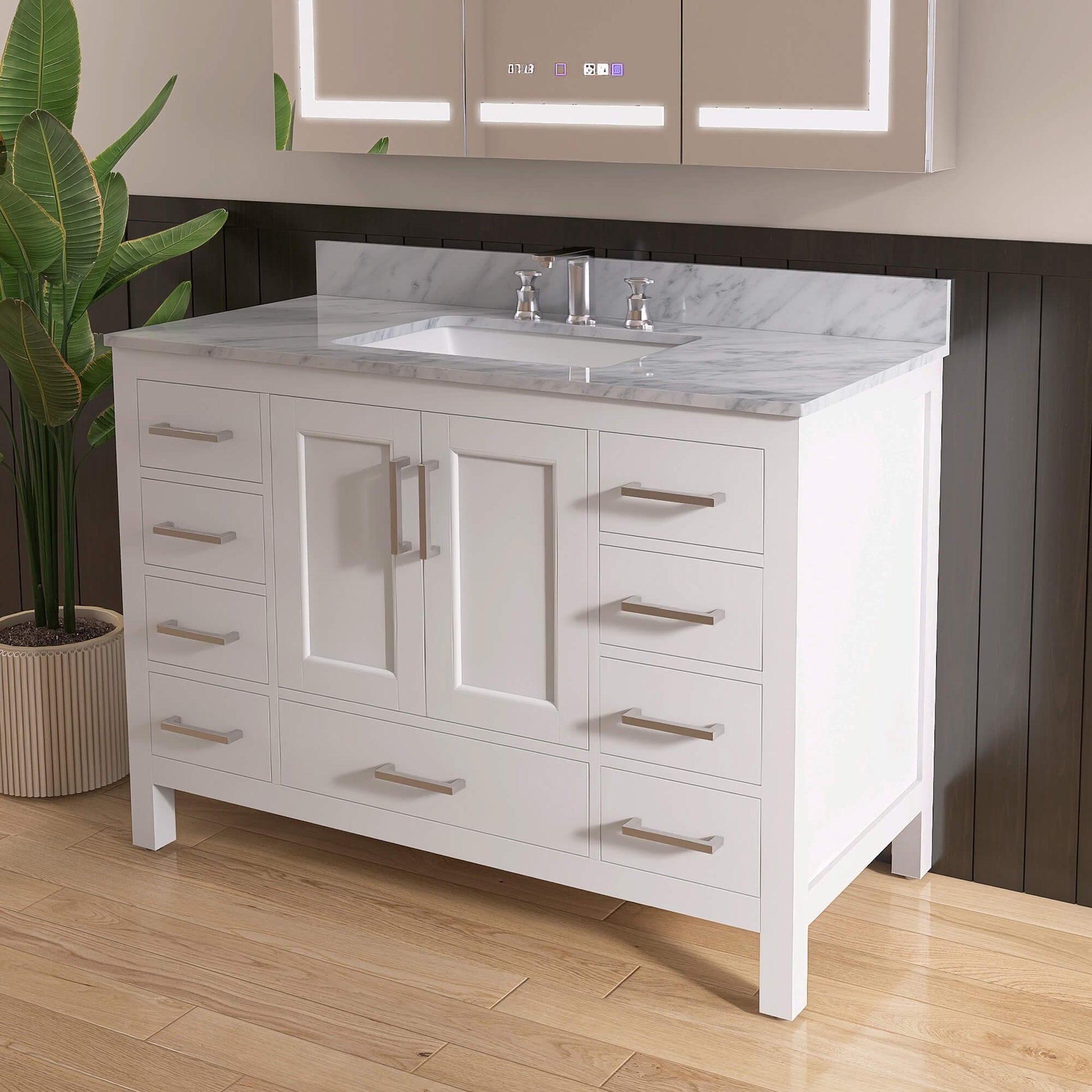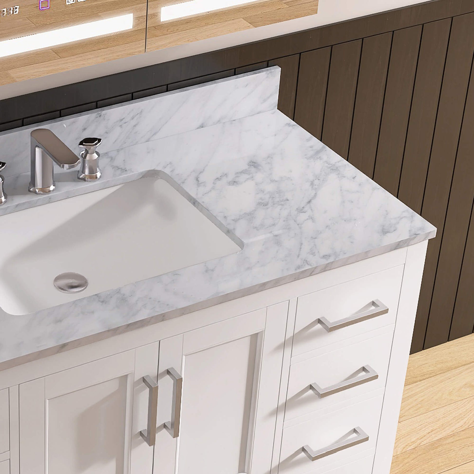 Sleek, Integrated Storage: Features soft-close drawers and adjustable shelving, providing silent and organized space for all your essentials, from toiletries to towels.