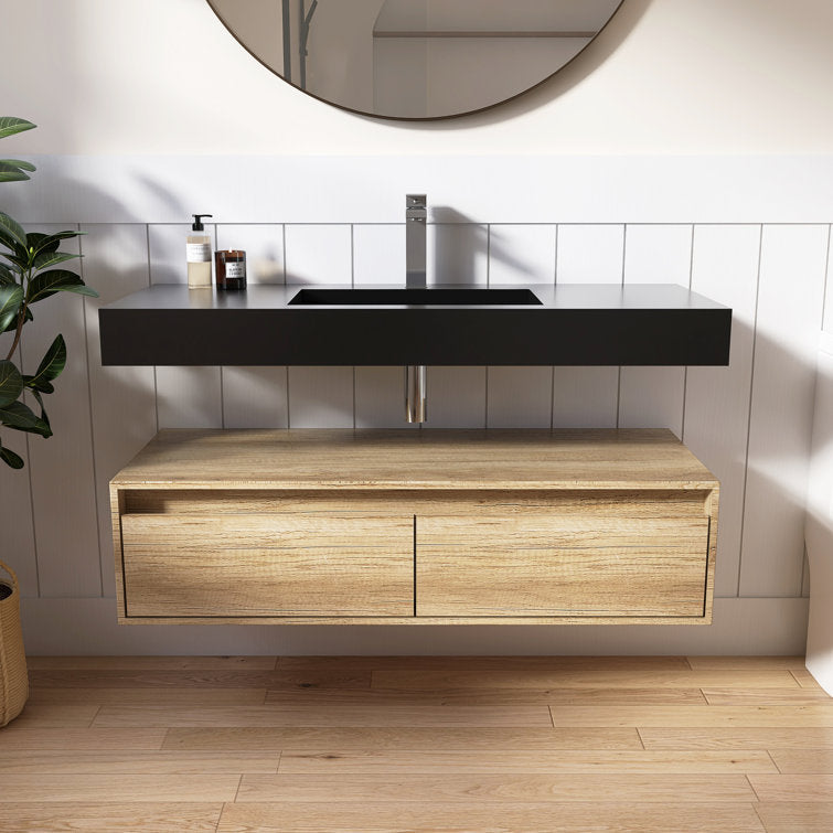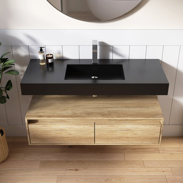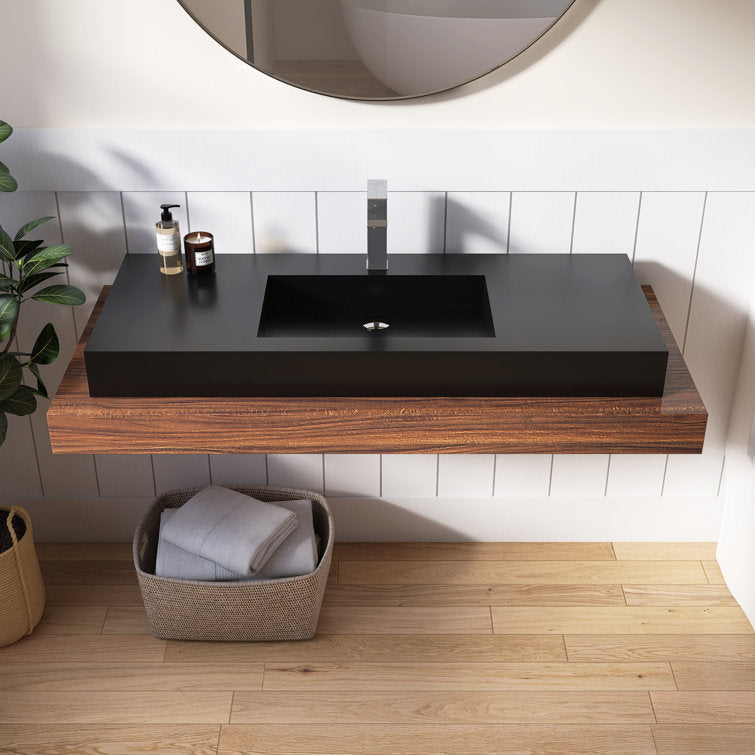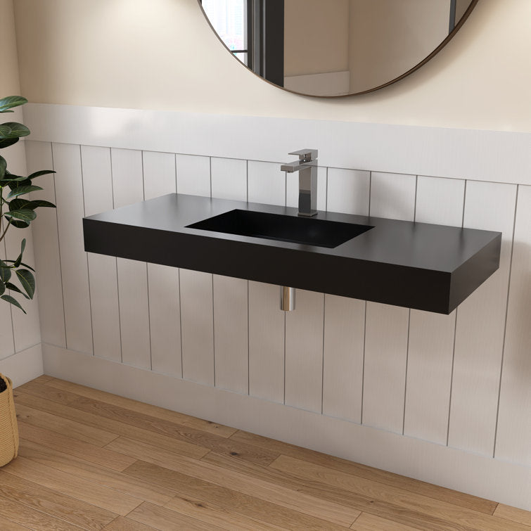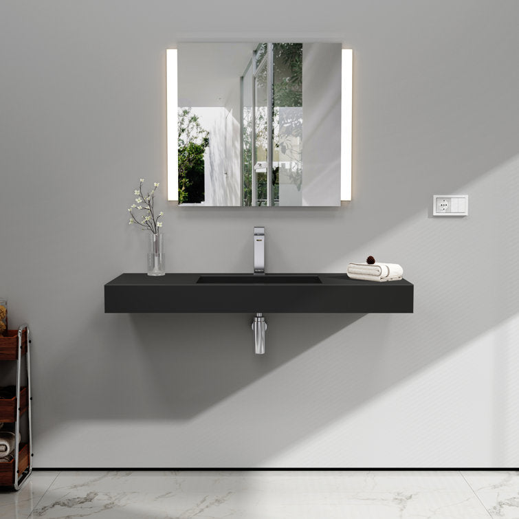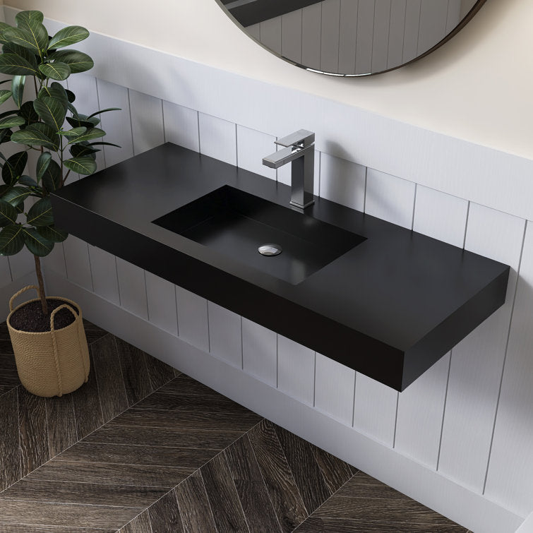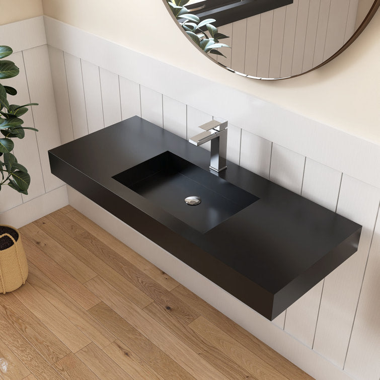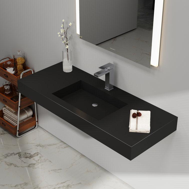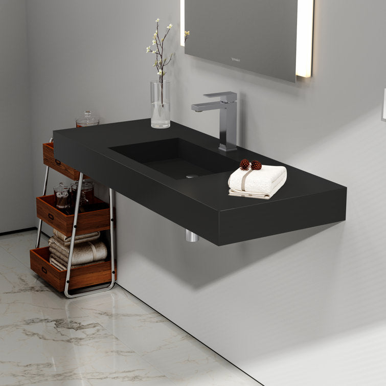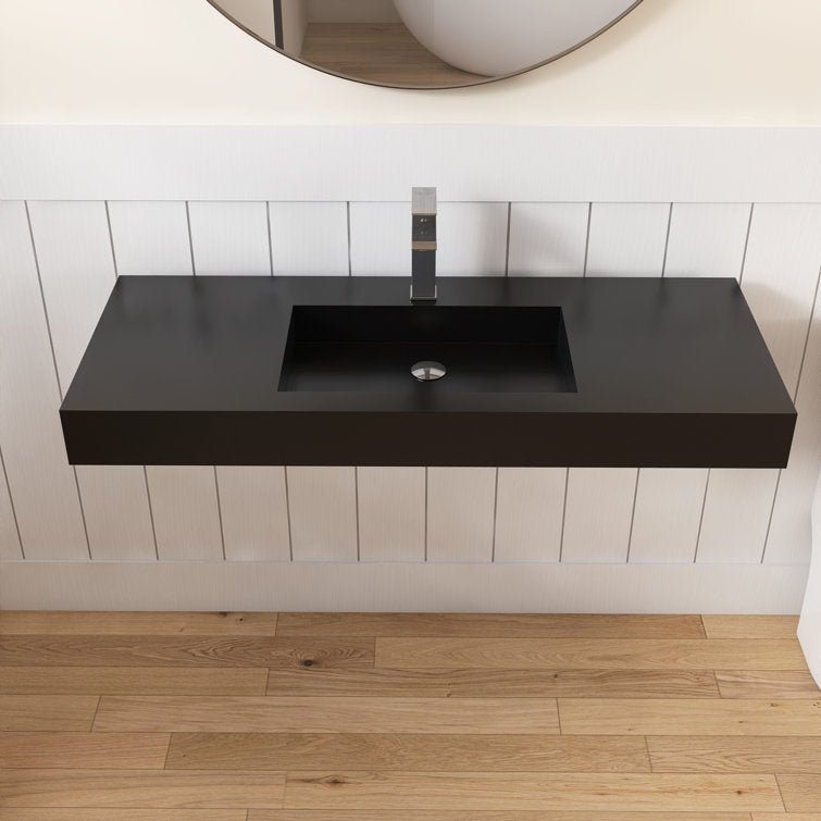 This minimalist wall-mounted single sink epitomizes contemporary elegance, offering a seamless fusion of modern aesthetics and functionality. Its sleek design creates an illusion of weightlessness, enhancing the visual appeal of any bathroom space. Crafted with precision, the sink boasts a standard rectangular shape adorned with crisp, refined lines, harmonizing effortlessly with various bathroom styles. Constructed from premium solid surface material, it guarantees unparalleled durability and longevity, ensuring a pristine appearance for years to come. Maintenance is a breeze, as the sink's surface can be effortlessly wiped clean with the most gentle cleaning agents, or tougher stains can be tackled with sandpaper. An exquisite addition to any washroom, bathroom, or powder room, this sink serves as a striking focal point, elevating the ambiance with its understated sophistication. 3 different pretty colors are optional, you could find the perfect one for your bathroom decoration.