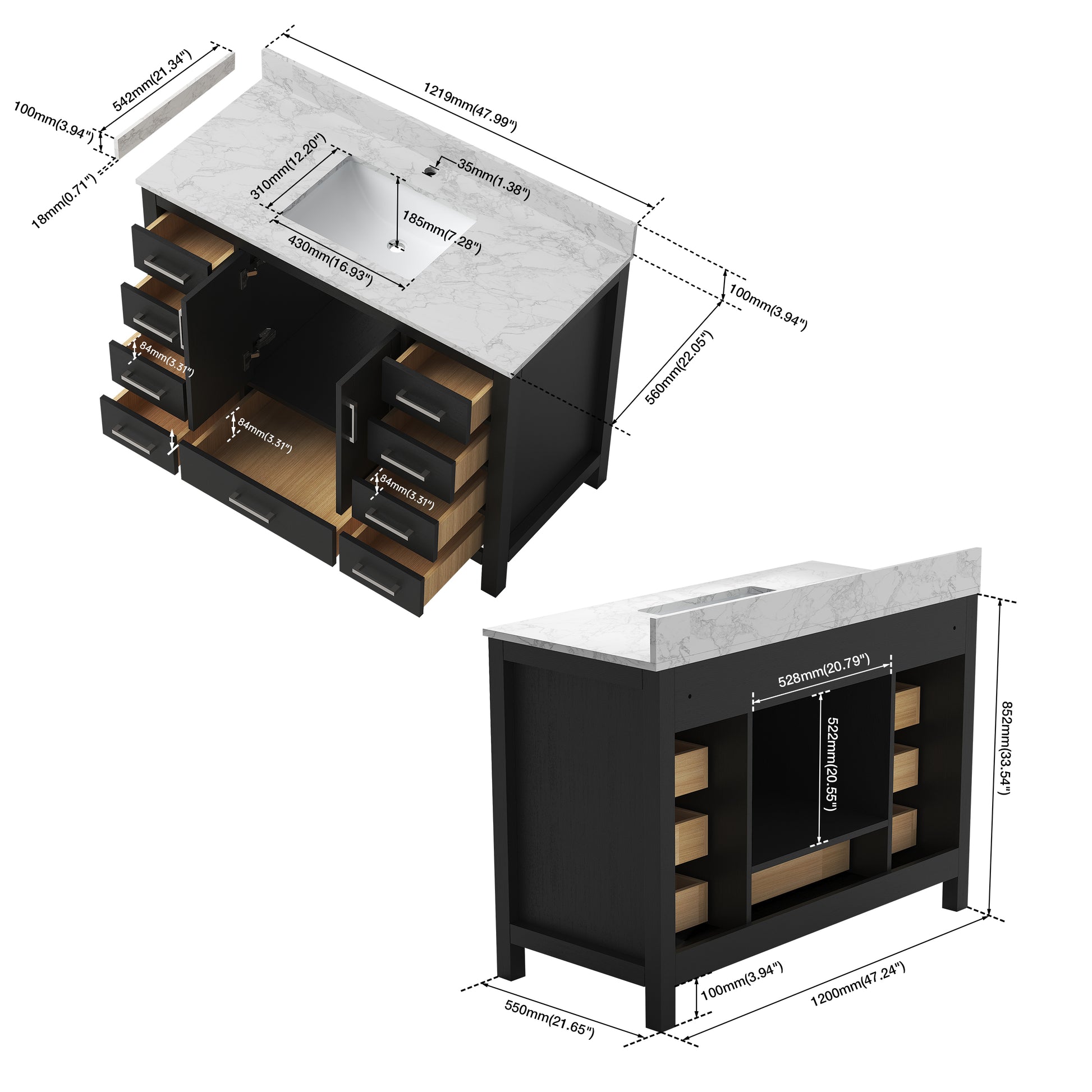 This 48" black oak-style bathroom vanity stands out with a bold black straight-grain oak finish, paired with a sturdy rubberwood and plywood structure and a clean natural pine interior. The modern dark wood tone contrasts beautifully with the 18mm white Carrara-style quartz countertop, creating a refined, high-end look suitable for contemporary bathrooms.