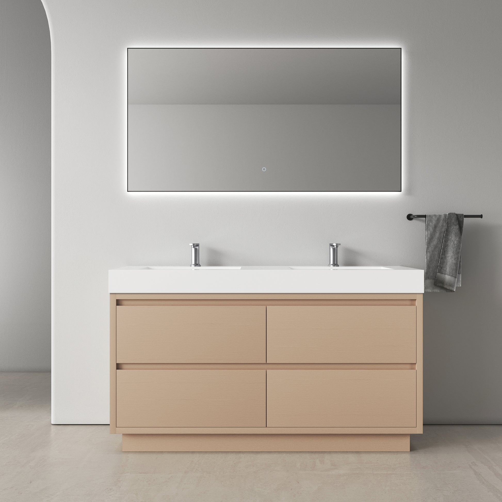 This 59-inch freestanding bathroom vanity is designed for modern bathrooms that require both functionality and a clean, contemporary aesthetic. The cabinet is constructed from durable PVC material, offering excellent moisture resistance and long-term stability in bathroom environments.