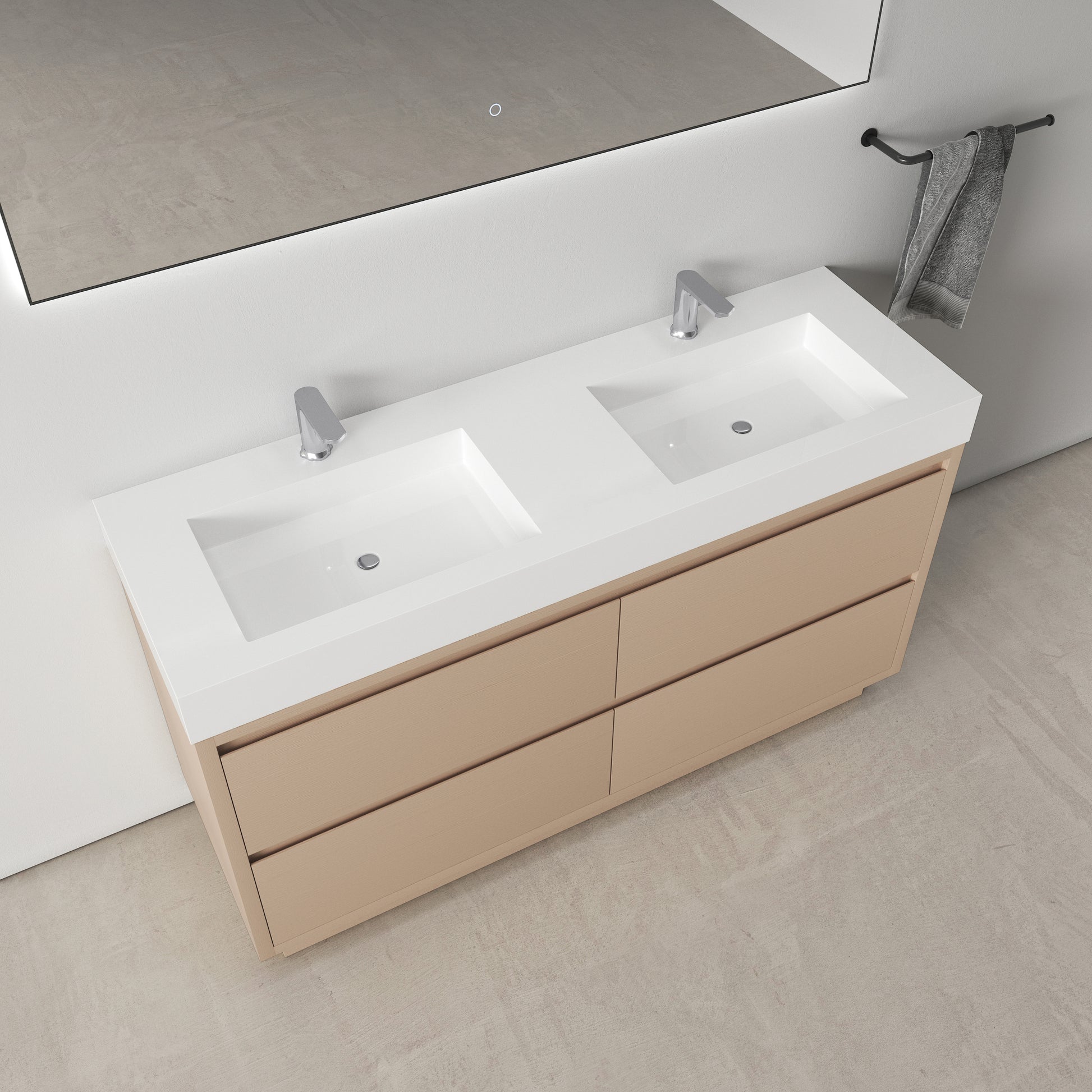 The vanity is paired with a gloss white solid surface double sink, featuring pre-drilled faucet holes for easy installation. The smooth, seamless surface is easy to clean and ideal for shared or family bathrooms.