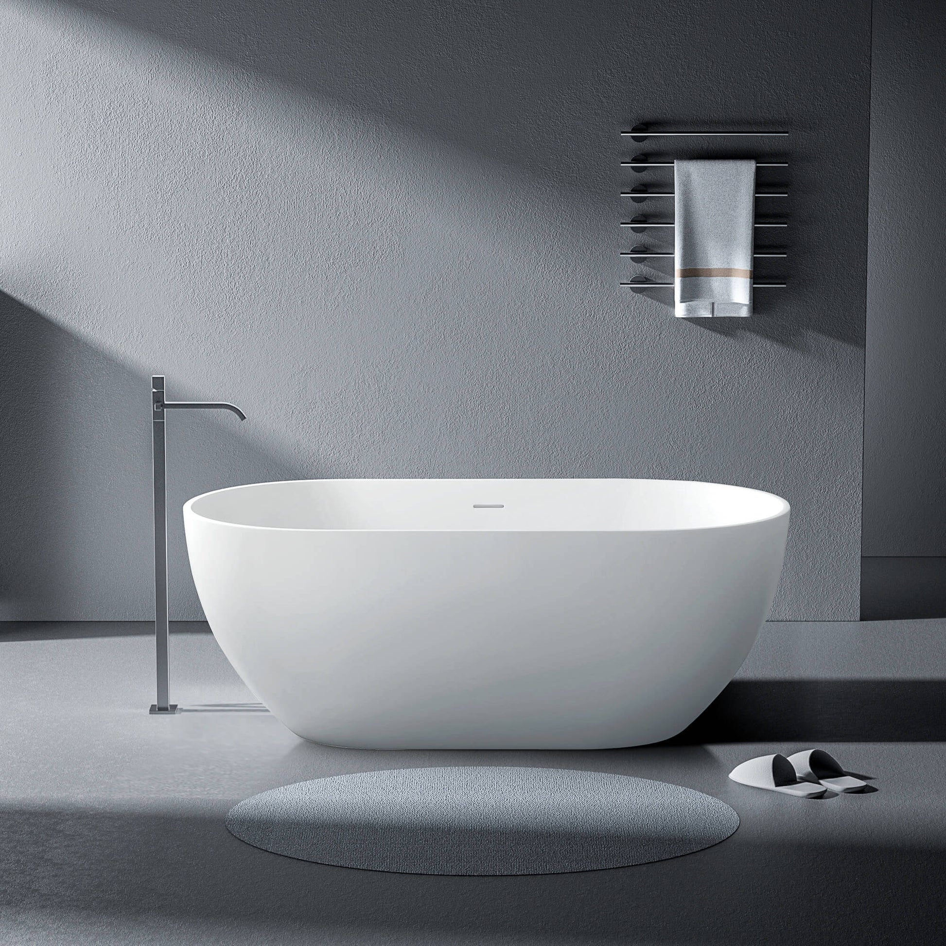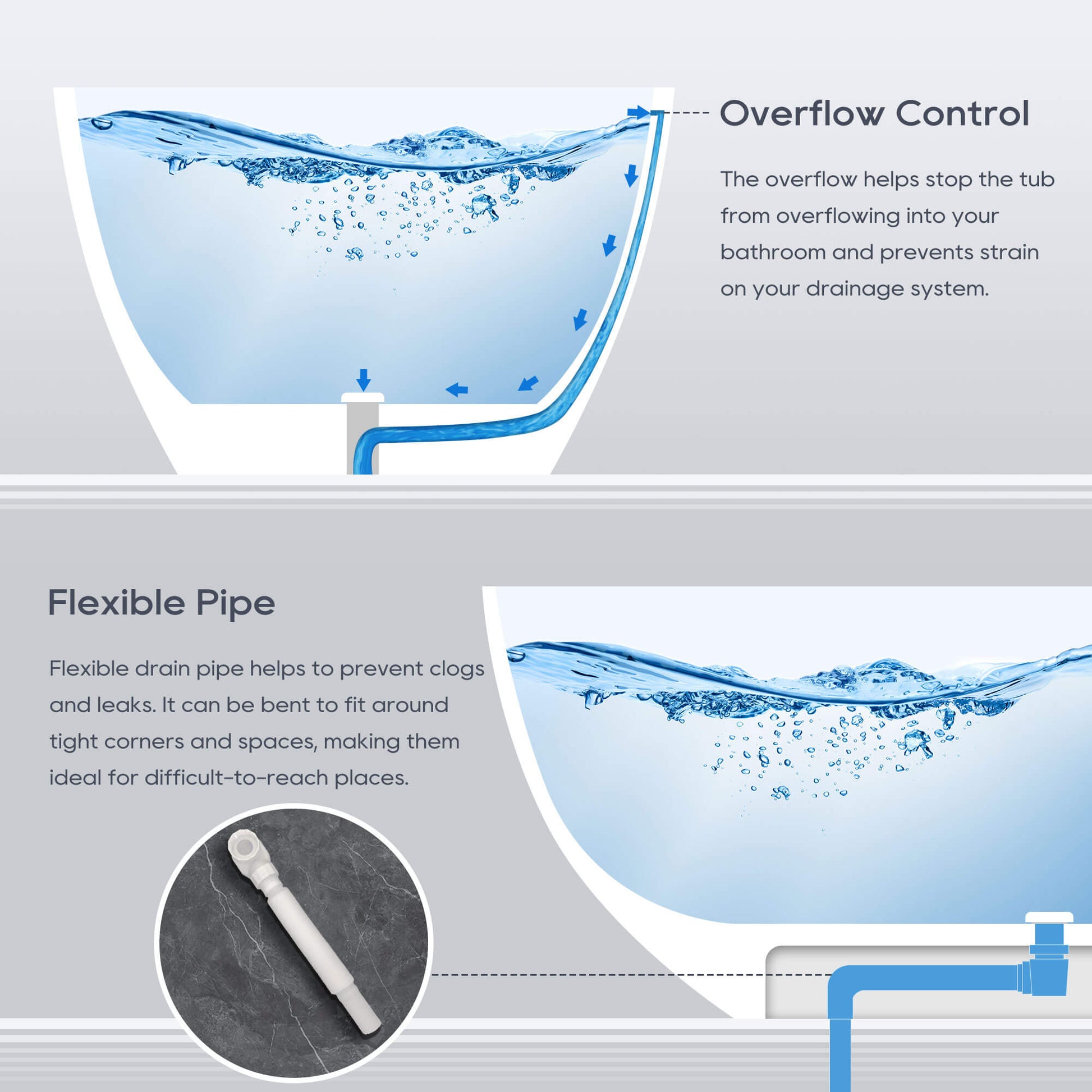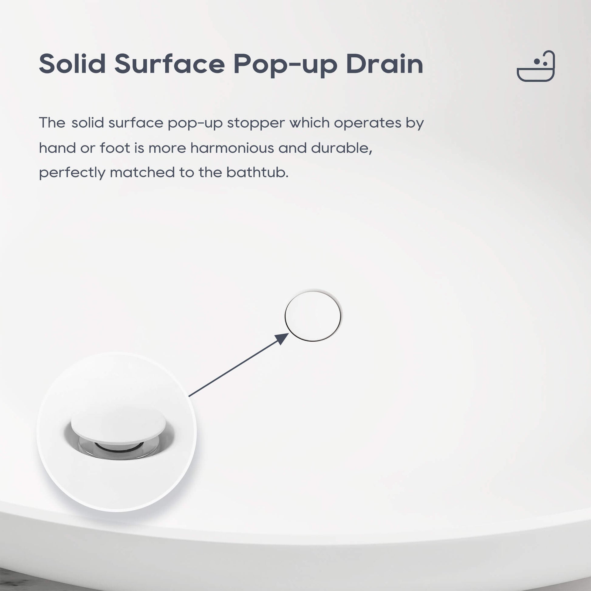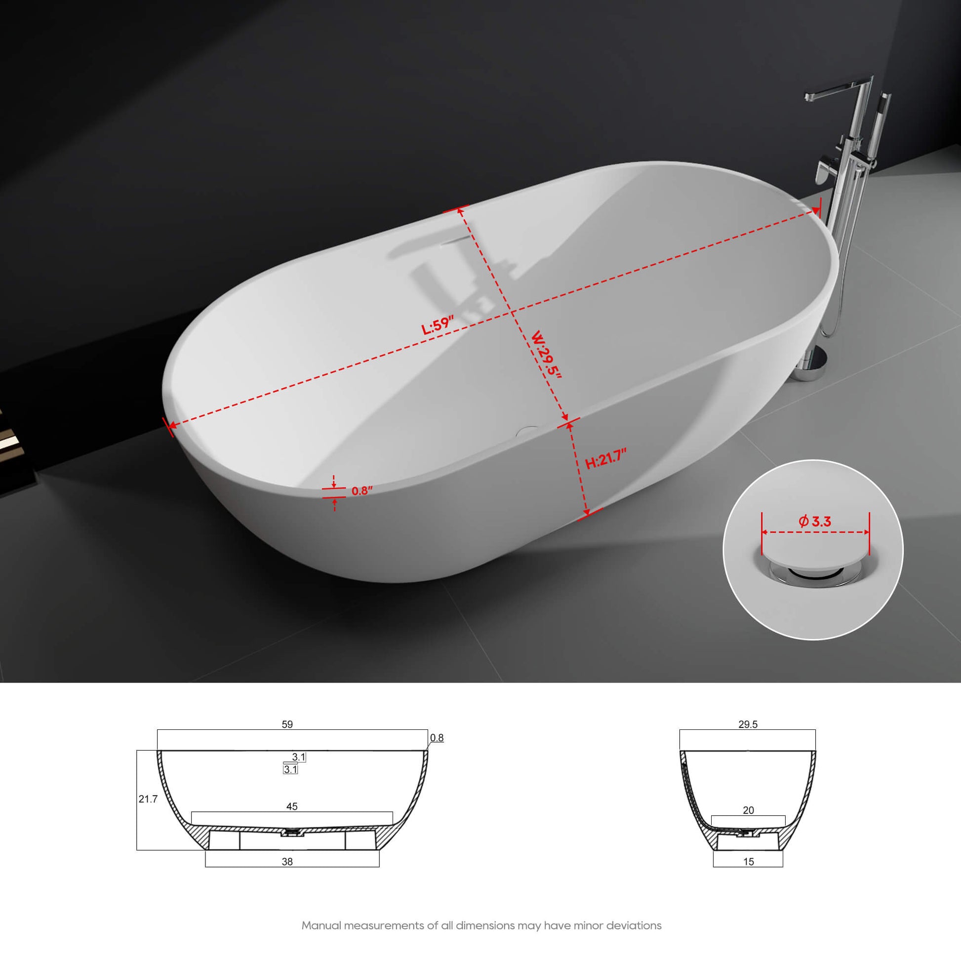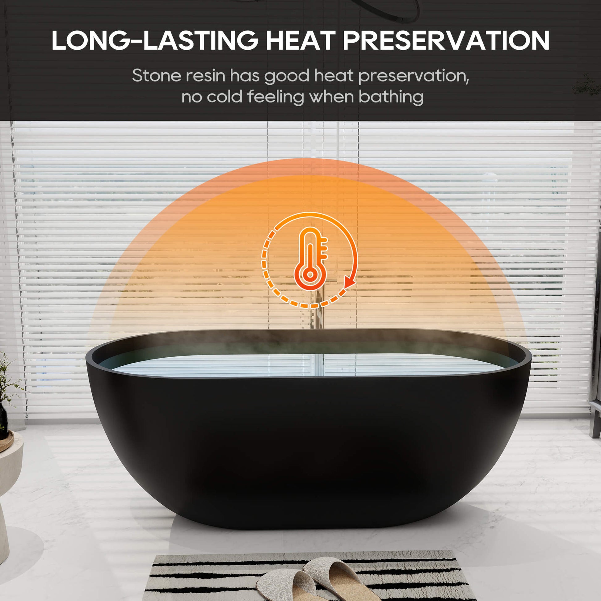 Crafted from high quality stone resin for durability and elegance, this bathtub is the finishing touch to your bathroom. The sturdy surface construction ensures that the tub is durable and elegant. The matte finish adds a modern touch to your space and enhances its appeal. Perfect for small spaces, this 59-inch bathtub combines practical functionality with sleek style. With its special repairable feature, you don't have to worry about minor scratches, damage, or stubborn stains. Our ergonomically curved tub features a sloped backrest and smooth edges that mold to your body's curves for a long soak without fatigue. The surface is finely polished for a warm, delicate touch and is non-slip, stain and heat resistant, making everyday cleaning easy and durable. Whether you're looking to create a stylish upgrade or enjoy a comfortable soaking experience, our stone resin freestanding bathtub is the perfect choice. Includes pop-up drain, but requires a separate drain hose (priced separately).