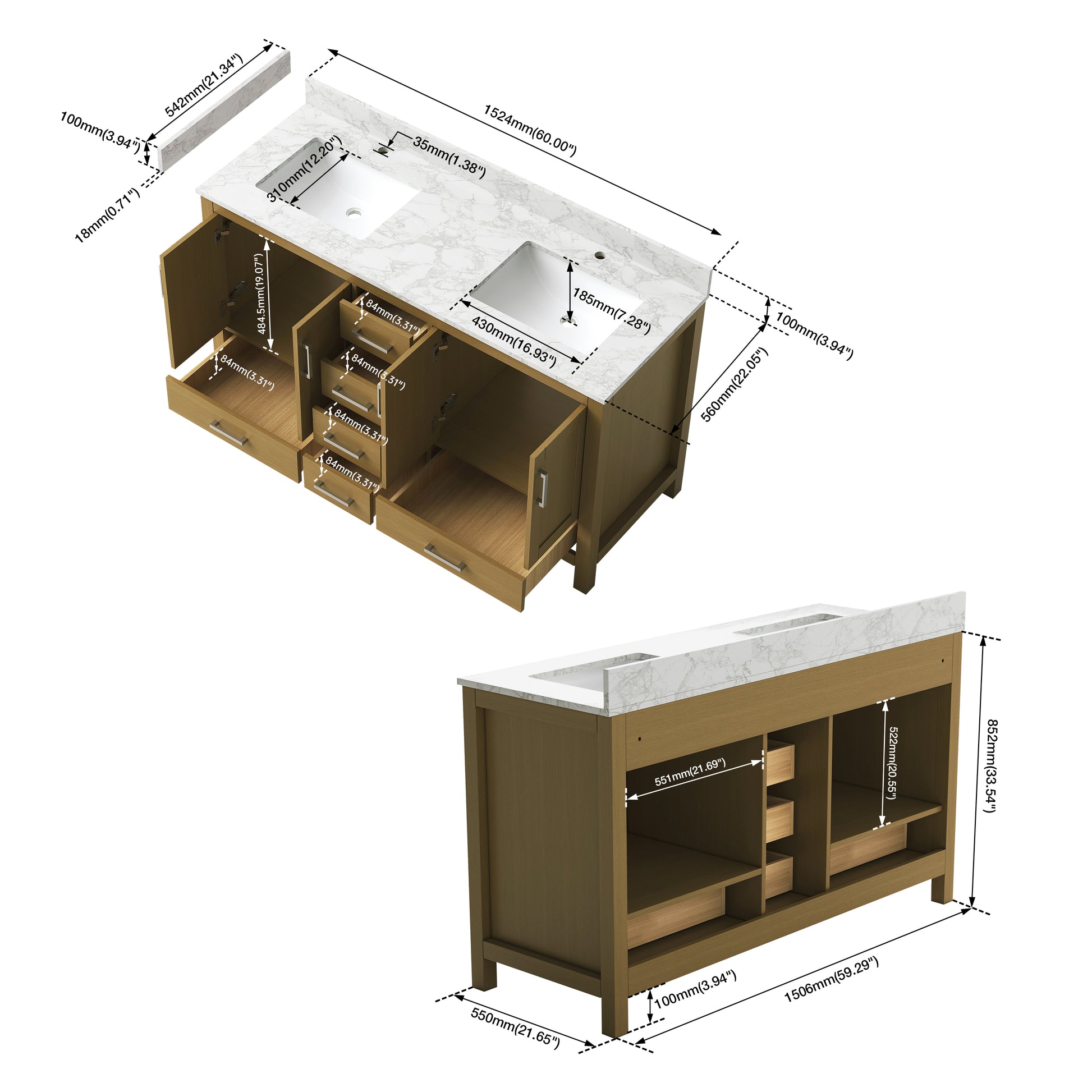 This bathroom vanity combines durability, modern style, and efficient storage. Built with rubberwood + plywood construction and a natural pine interior, the cabinet is finished with straight-grain ash veneer for a clean, contemporary look. The vanity includes an 18mm white Carrara-style quartz countertop, a 20-inch CUPC undermount rectangular basin, and 100mm backsplash with side splash, offering strong water protection and long-term reliability.