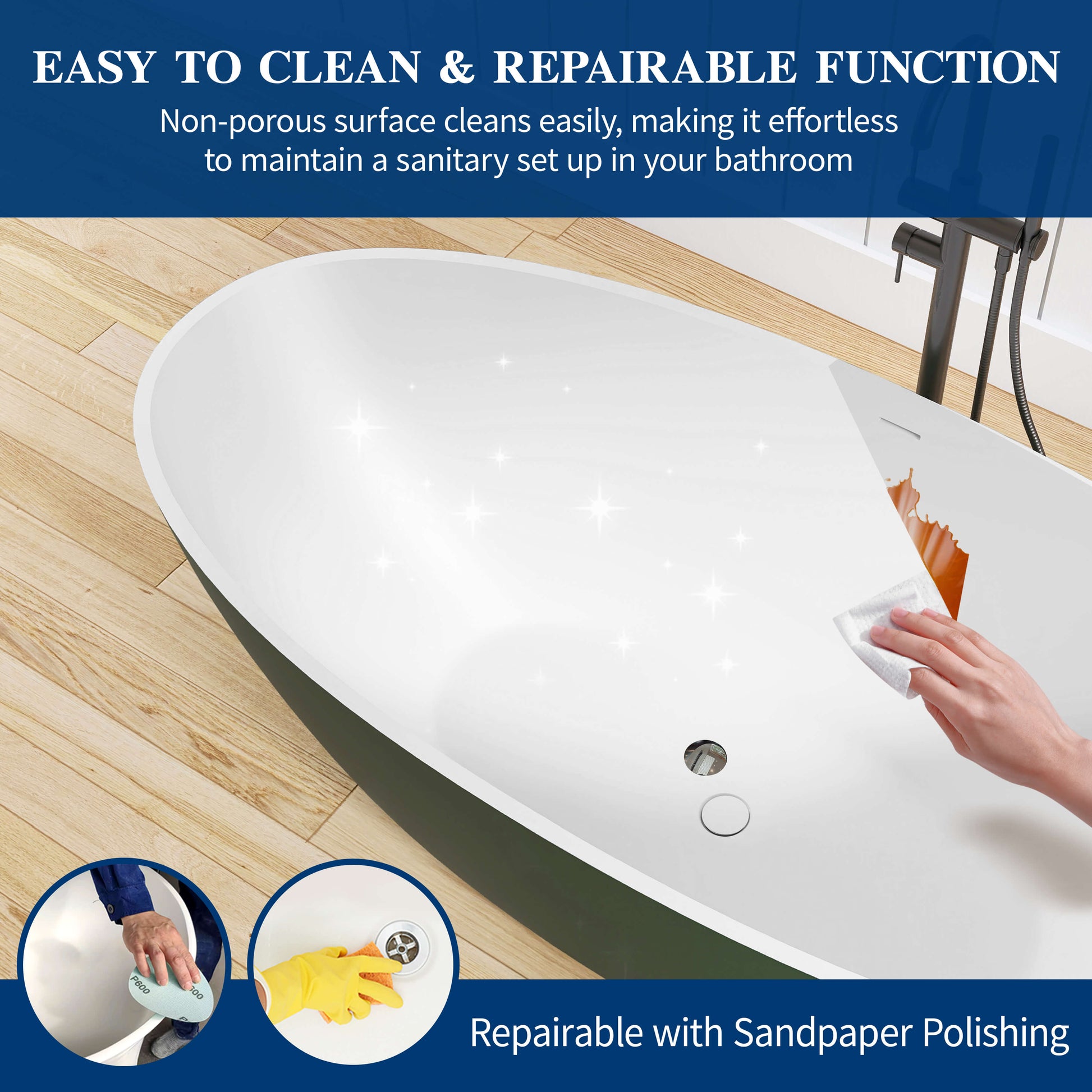 Minor scratches or stubborn stains can be easily restored with simple sanding. This keeps the tub looking consistently fresh with minimal effort.