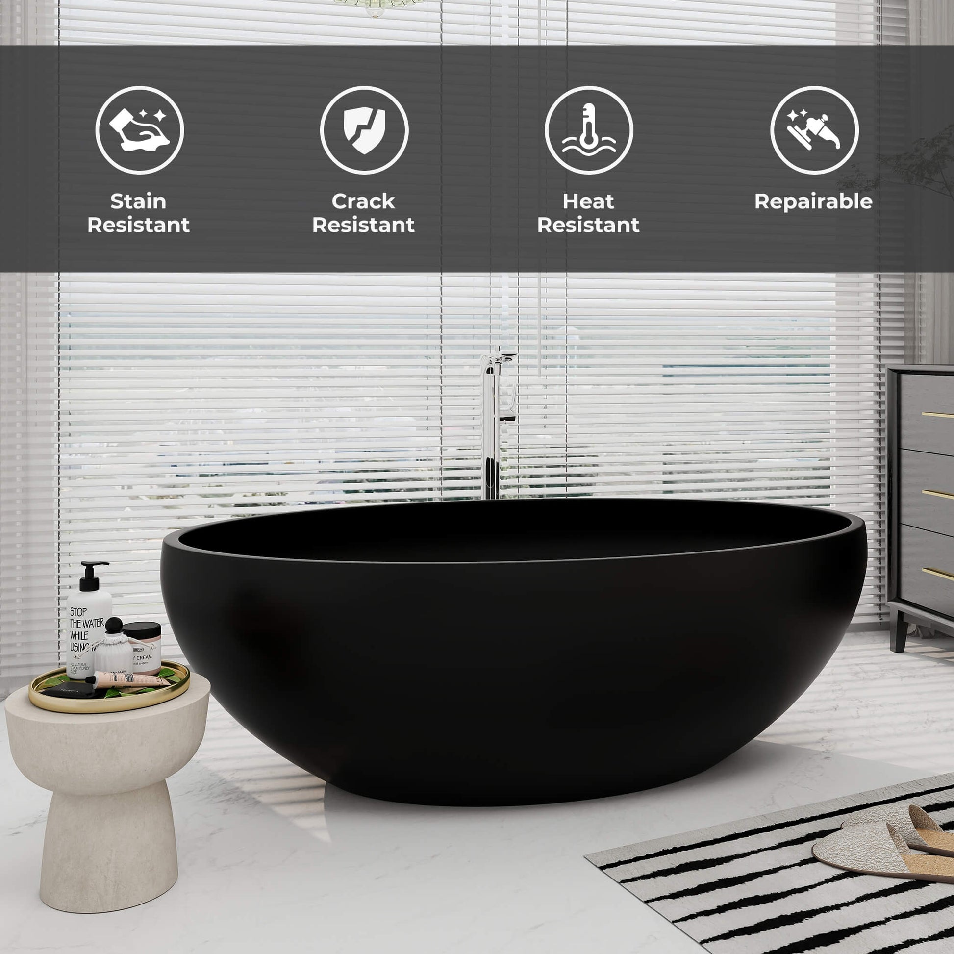 - Remarkable Durability: Special Material by the combination of stone resin, resulting in a robust, non-porous surface resistant to stains and scratches. One-piece design, flawless bathing surface, good choice for private and commercial use.