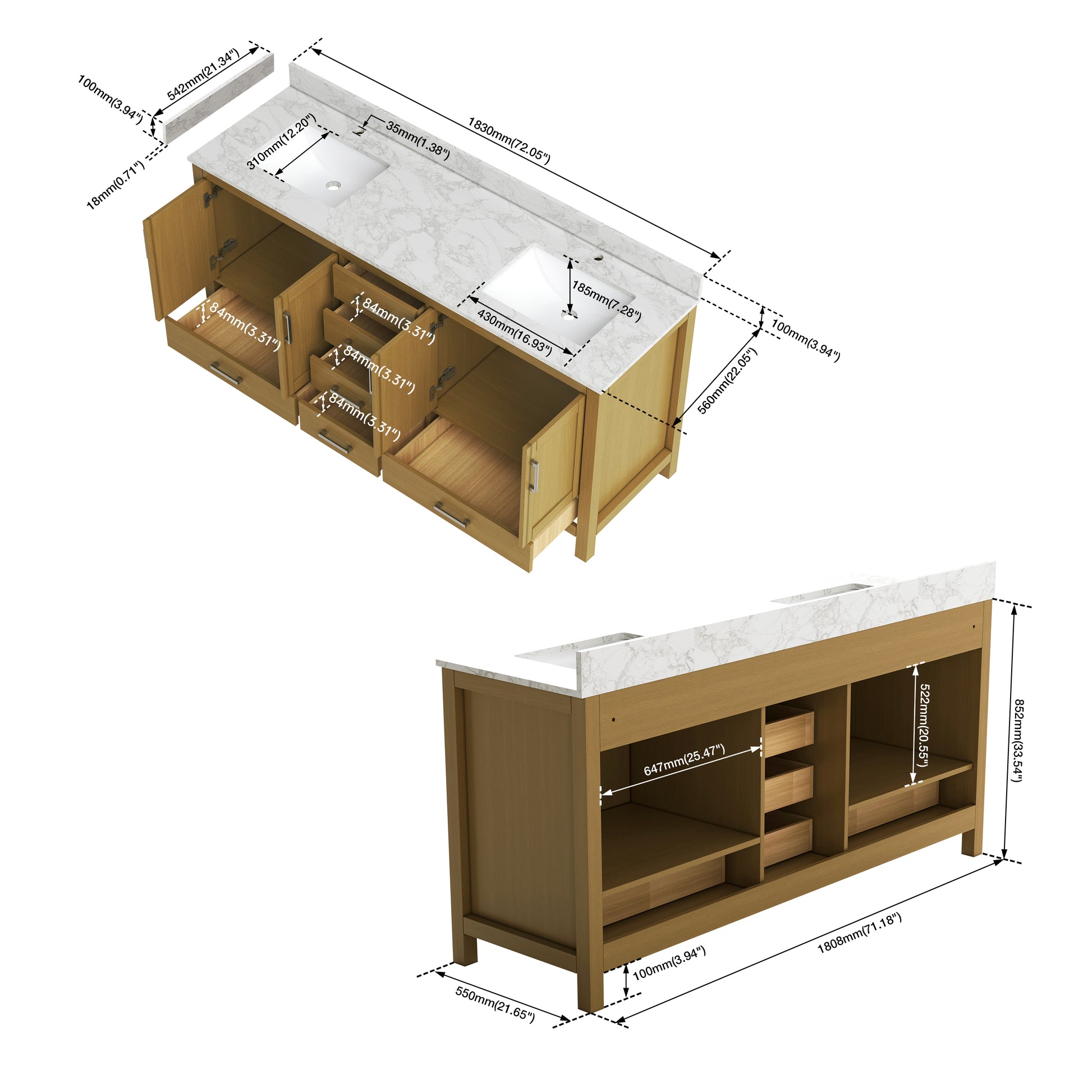 This double-sink bathroom vanity combines premium craftsmanship with a warm natural wood aesthetic. Built with a solid rubberwood frame and veneer finish, paired with a natural pine interior, it offers durability, stability, and a refined modern appearance. The vanity is topped with a large white Carrara-style quartz countertop, delivering a clean, elegant, and long-lasting surface. Accompanied by straightforward assembly instructions, this elegant piece is easy to install.