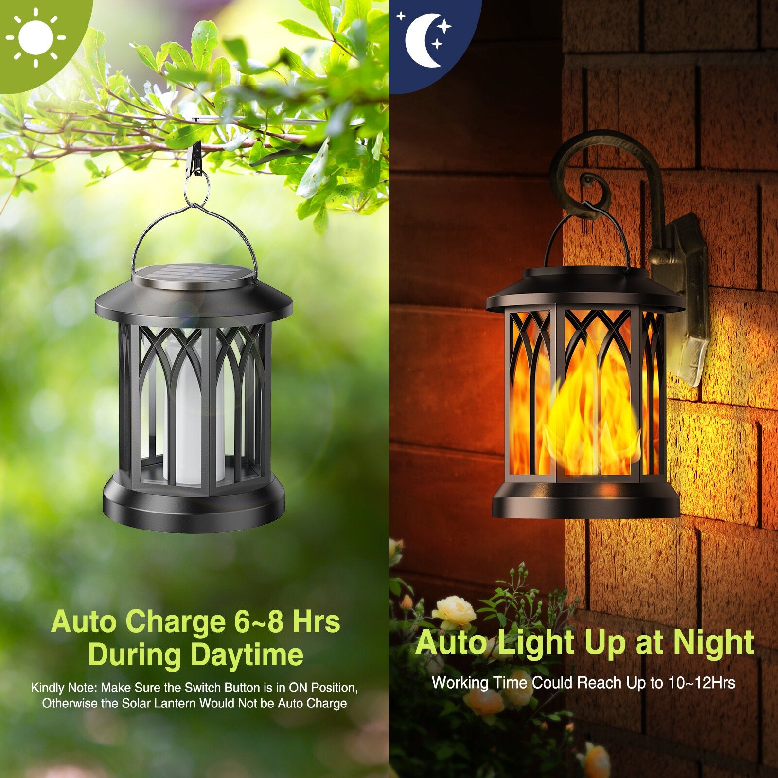- 【SOLAR POWERED GARDEN LANTERN】Upgraded wider version monocrystalline solar panel convert sunlight into electricity 20% more efficient than ordinary solar lights. Built-in rechargeable battery enables 8-10 hours lighting time after fully charging. Unlike traditional decorative torch lights, these solar garden flame lights need no fuel, so eco-friendly and energy saving.